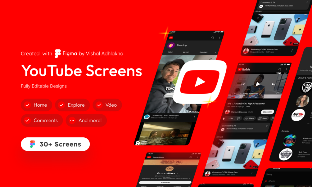This Figma file contains all the editable screens designs for YouTube